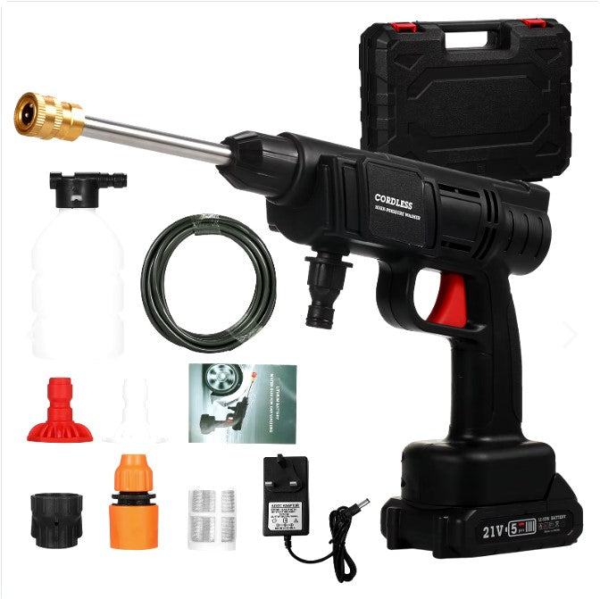 Cargador de batería, tubería de agua de 5 m, filtro, varilla de extensión, boquilla 0° y 40° y recipiente para jabón.